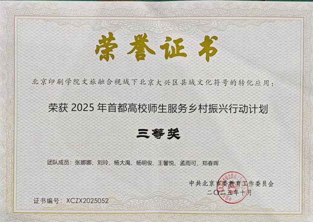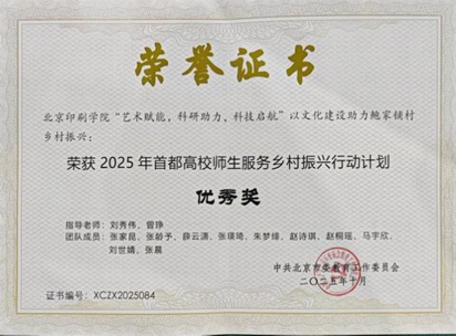 今年暑期,为教育引导广大师生服务国家重大战略,在祖国和人民最需要的地方发光发热,上好首都特色“大思政课”,市委教育工委、市教委组织开展了2025年首都高校师生服务乡村振兴行动计划。学校积极响应号召,经广泛动员、择优申报,共有2支团队成功获批立项并圆满完成实践任务。在项目评选中,《文旅融合视域下北京大兴区县域文化符号的转化应用》获三等奖,《“艺术赋能,科研助力,科技启航”—— 以文化建设助力鲍家铺村乡村振兴》获优秀奖。