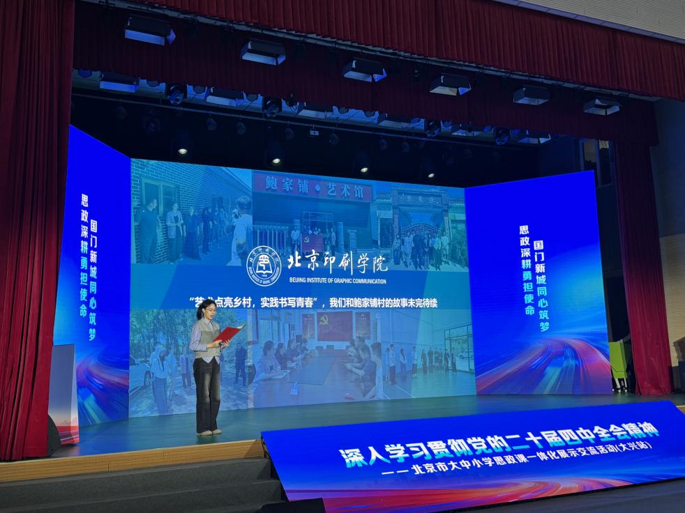 12月19日,由市委教育工委、市教委主办的深入学习贯彻党的二十届四中全会精神北京市大中小学思政课一体化展示交流活动(大兴站)在北京一零一中大兴分校举行,学校《“艺术赋能,科研助力,科技启航”以文化建设助力鲍家铺村乡村振兴》项目作为2025年首都高校师生服务乡村振兴行动计划实践团队代表进行现场汇报交流,团队成员以“艺术赋能”“科技启航”“红色传承”为主线讲述北印学子以专业赋能扎根基层、服务乡村的青春风采,充分彰显学校“三观三感”育人成效。