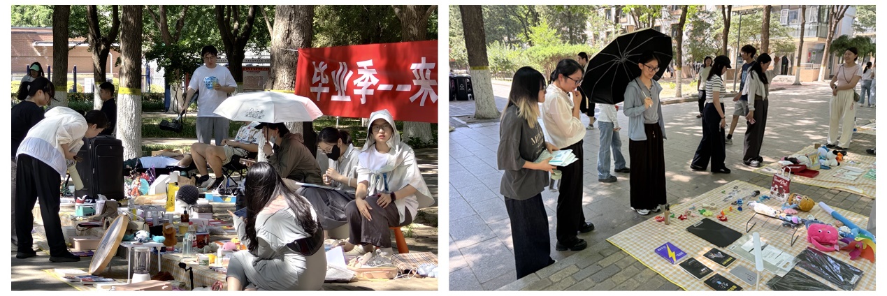 活动现场,毕业生精心布置的近百个摊位有序排开,书籍、文具、生活用品、电子产品、文创产品等琳琅满目,实用且有趣的闲置物品吸引了众多目光。摊主们热情洋溢地讲述每件物品背后的故事,师生们驻足挑选,气氛热闹非凡。