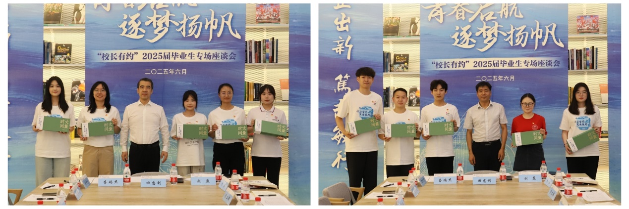 在交流中,与会教师为毕业生们送上真挚祝福。田忠利、刘益为毕业生代表赠送学校定制万年历作为毕业纪念,勉励同学们珍惜当下和未来的每时每刻,找准人生目标方向,并矢志不渝为之奋斗,让青春在祖国最需要的地方绽放绚丽之花。