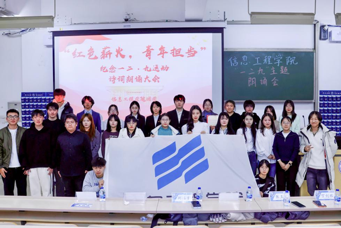信息工程学院组织团员青年认真学习“一二・九”运动的历史脉络与时代意义,通过举办红色经典诗歌朗诵会、新发展团员入团仪式等系列活动,带领同学们重温那段救亡图存的峥嵘岁月,引导大家在沉浸式体验中践行青春使命,进一步深化对爱国主义精神的理解与认同,切实明确新时代青年在强国建设、民族复兴征程中的责任与担当。