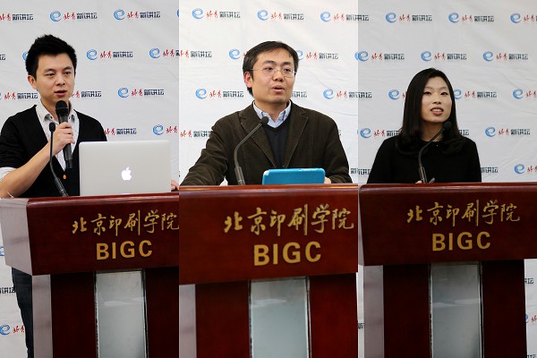 在北印的此次讲座交流活动是第二届北京阅读季北京大学生读书节的系列活动。活动中,《中国国家旅游》主编刘天北以“新媒体人的美德”为主题发言,从“新媒体时代的专业媒体”、“新媒体人的四种美德”、“《中国国家旅游》杂志的介绍”三个方面进行交流,刘天北称:“专业媒体人要替读者阅读,读者失去仔细阅读的耐心,专业媒体人要填补空白。”他主张新媒体要有观念塑造力,视觉规划力,说服力,均衡感。微信平台《微杂志》主编温瑶以简单明了的方式,就“手机时代的碎片化阅读”为主题进行了交流。她轻松诙谐的演讲方式活跃了现场气氛,她说,作为新媒体,需要具备三要素,即“粉丝群落化”、“内容重构”和“产生归属感”。《精品购物指南》新媒体中心总经理骆天天以视频开篇,提出新媒体的媒体价值要迎合时代特点。他认为纸质媒体虽然遭到了新媒体的强大冲击,但它终究不能被取代。对于如何整合网络流程,他提出六大法则,即:细节市场,引导抉择,社交互动化,新媒体语言化,多元素化,基础功能化。