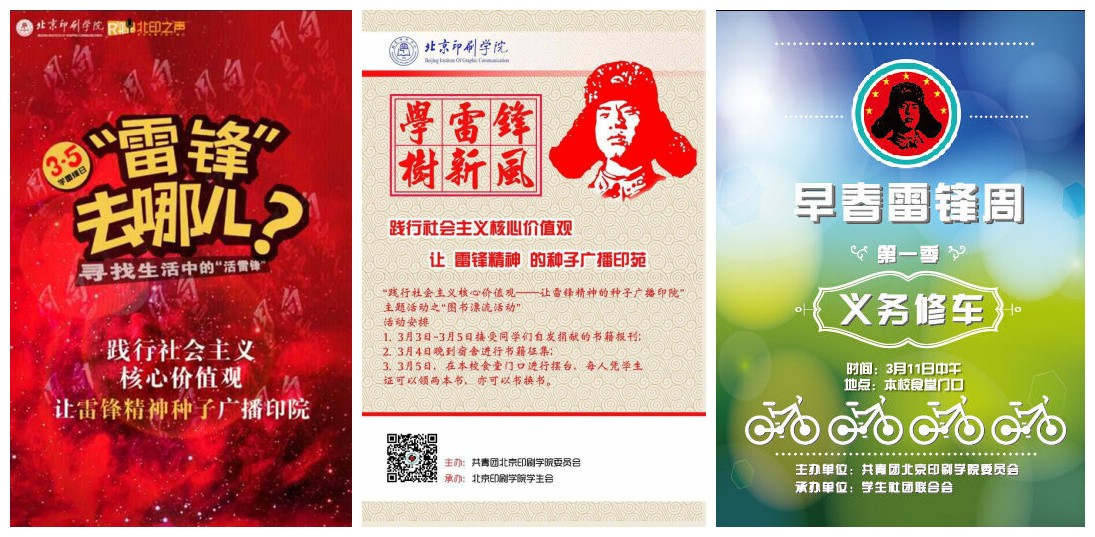 根据活动安排,由校学生会举办的“图书漂流”活动在微信平台发出宣传通知后,当日收到学校师生自愿捐赠的图书总计3326本,在活动当中,共发出和交换两千余本,其中包括各类名著、杂志、教材等;校广播台此次发起以“践行社会主义核心价值观 让雷锋精神种子广播印苑”为主题的“学雷锋”点歌节,通过在食堂门口摆台,派发宣传单,点歌单等形式,呼吁印院学子为身边的活雷锋送上赞美和祝福,在活动中领悟雷锋精神真谛,在行动中争做雷锋传人。社联还组织学生进行了“雷锋精神在我心,核心价值引我行”的签名活动。