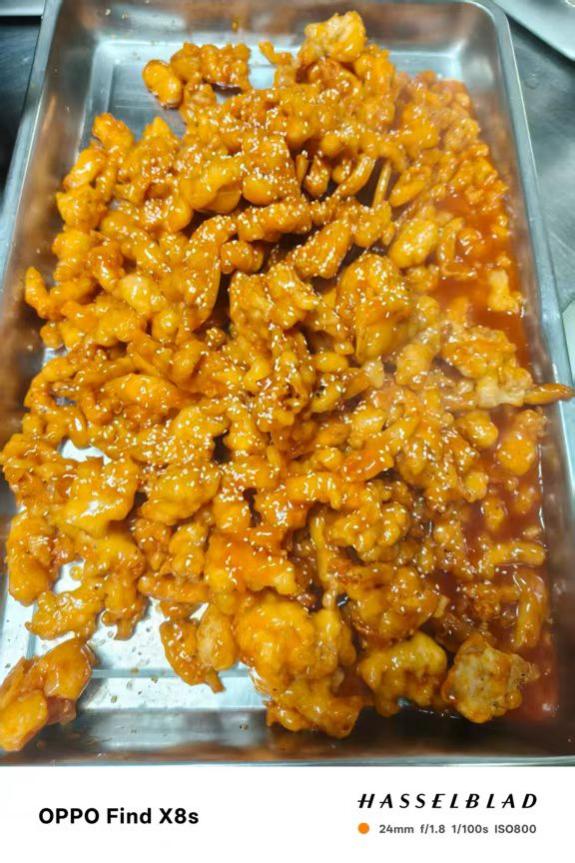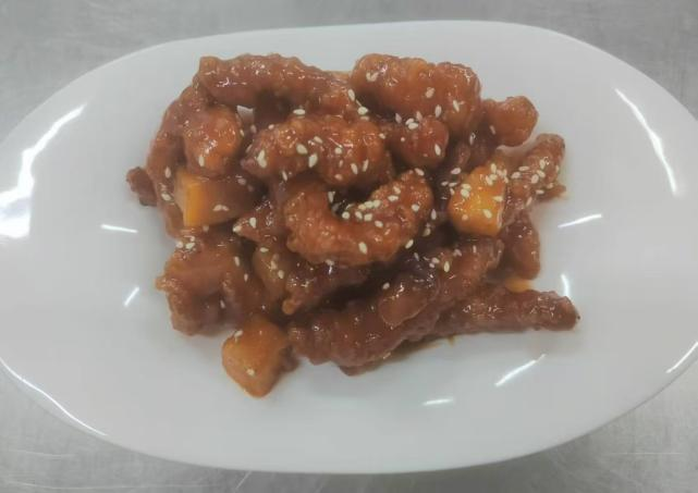精选猪里脊肉,裹粉后炸至金黄酥脆,再与特制糖醋汁快速翻炒,让每一块肉都均匀裹上酸甜的酱汁。撒上芝麻,增添了香气和口感,是一道色泽红亮泽、酸甜可口的经典菜肴,让人食欲大开。