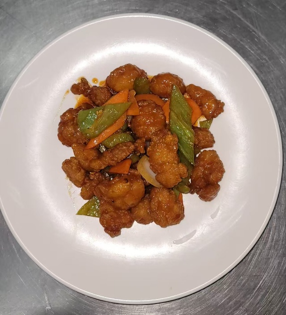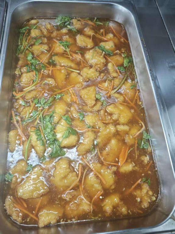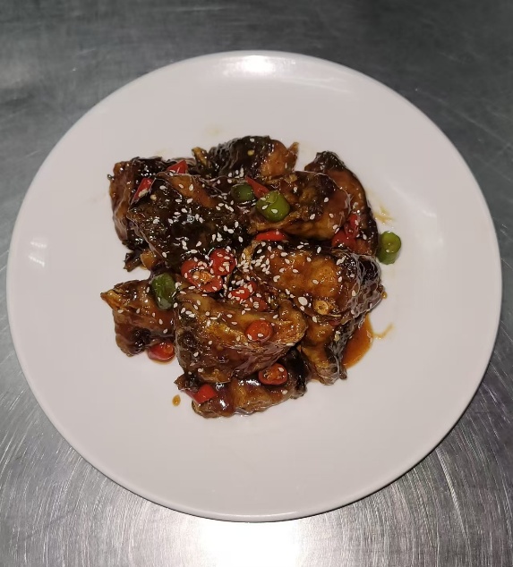 选用鲜嫩鱼肉,切块后精心烹饪,外皮微焦而内里柔嫩,淋上特制的甜辣烧汁,每一口都是甜与辣的完美融合。撒上芝麻和青红辣椒点缀,不仅增添了香气,更让这道菜色香味俱全,是餐桌上的诱人佳肴。