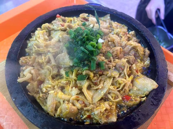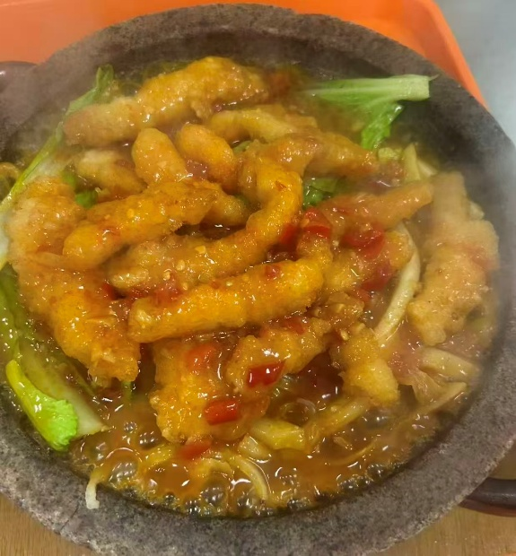精选猪肉切条,裹粉油炸至金黄酥脆,再与新鲜蔬菜一同放入滚烫的石锅中,肉香与菜香在热力作用下完美融合。石锅的保温效果让整道菜从头到尾热腾腾,是让人暖心暖胃的美味佳肴。