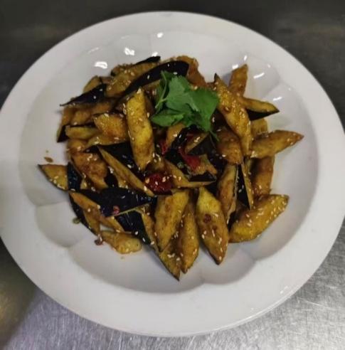 茄子切条,经过油炸至外皮酥脆,内里软嫩,再与特制的香料和调料快速翻炒。芝麻和香菜的点缀,增添了额外的香气和色彩,使得整道菜品香酥中带有清新,是让人难以忘怀的美味佳肴。